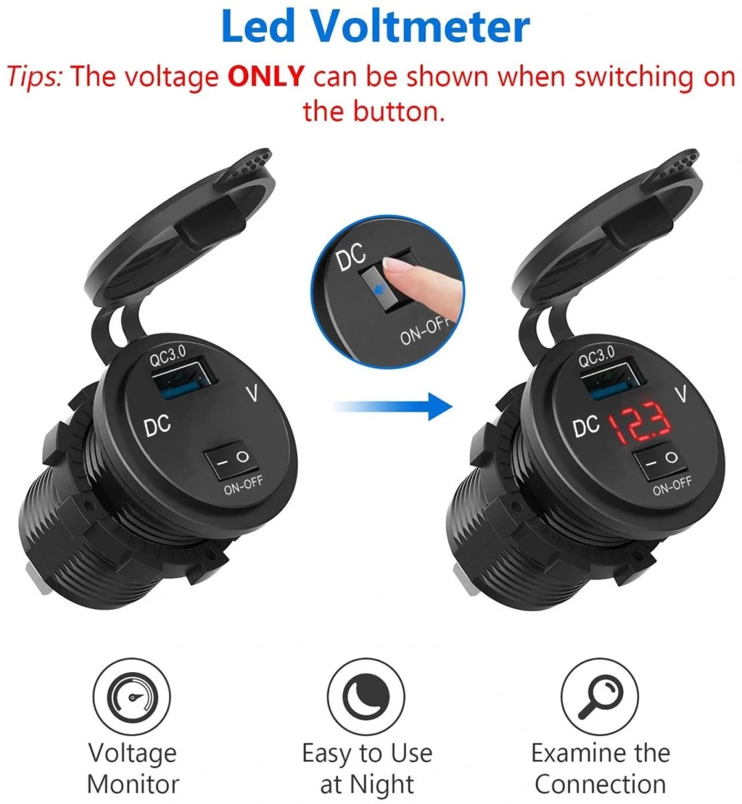 USB priz soket QC3.0 araba şarjı 12V/24V Led'li dijital voltmetre ile On/Off anahtarı